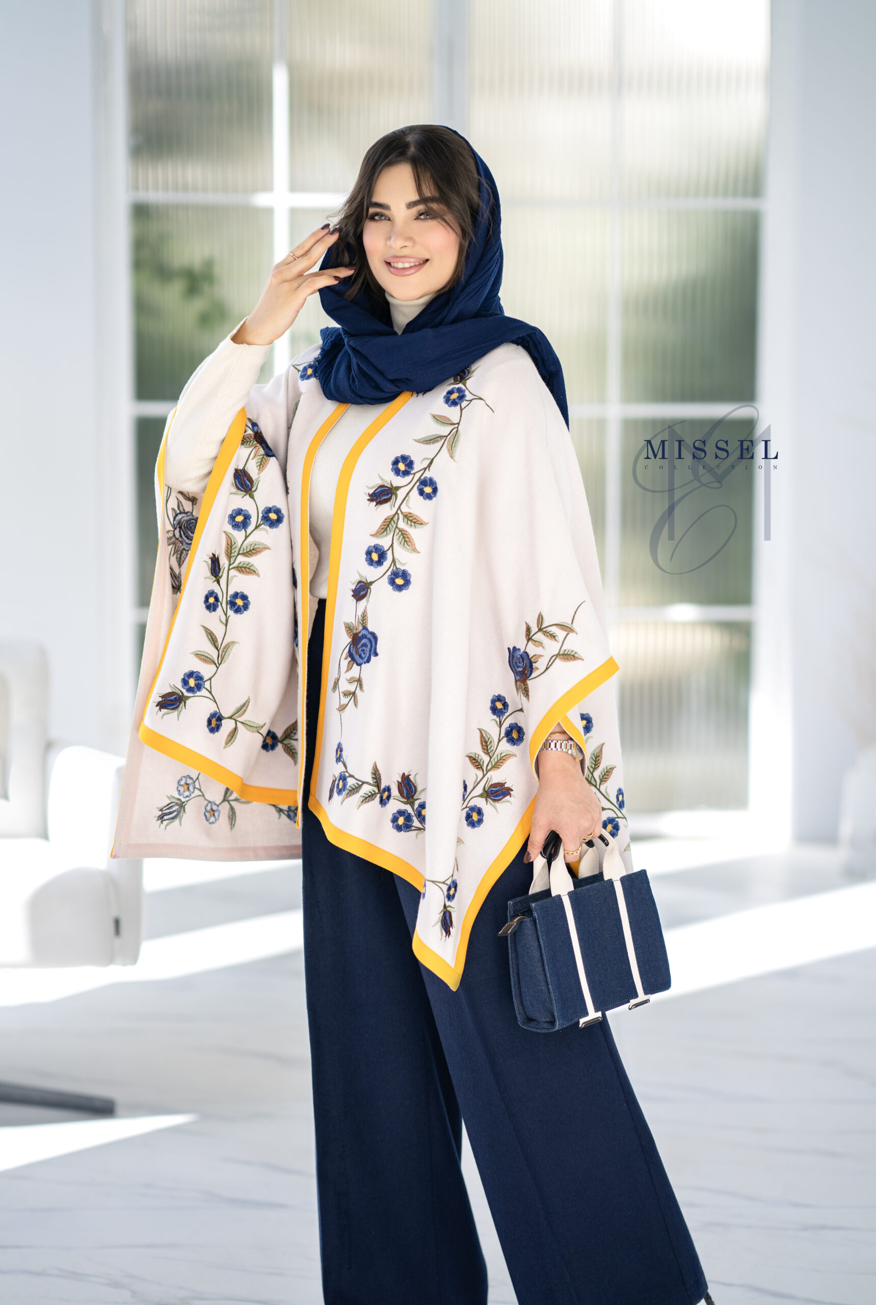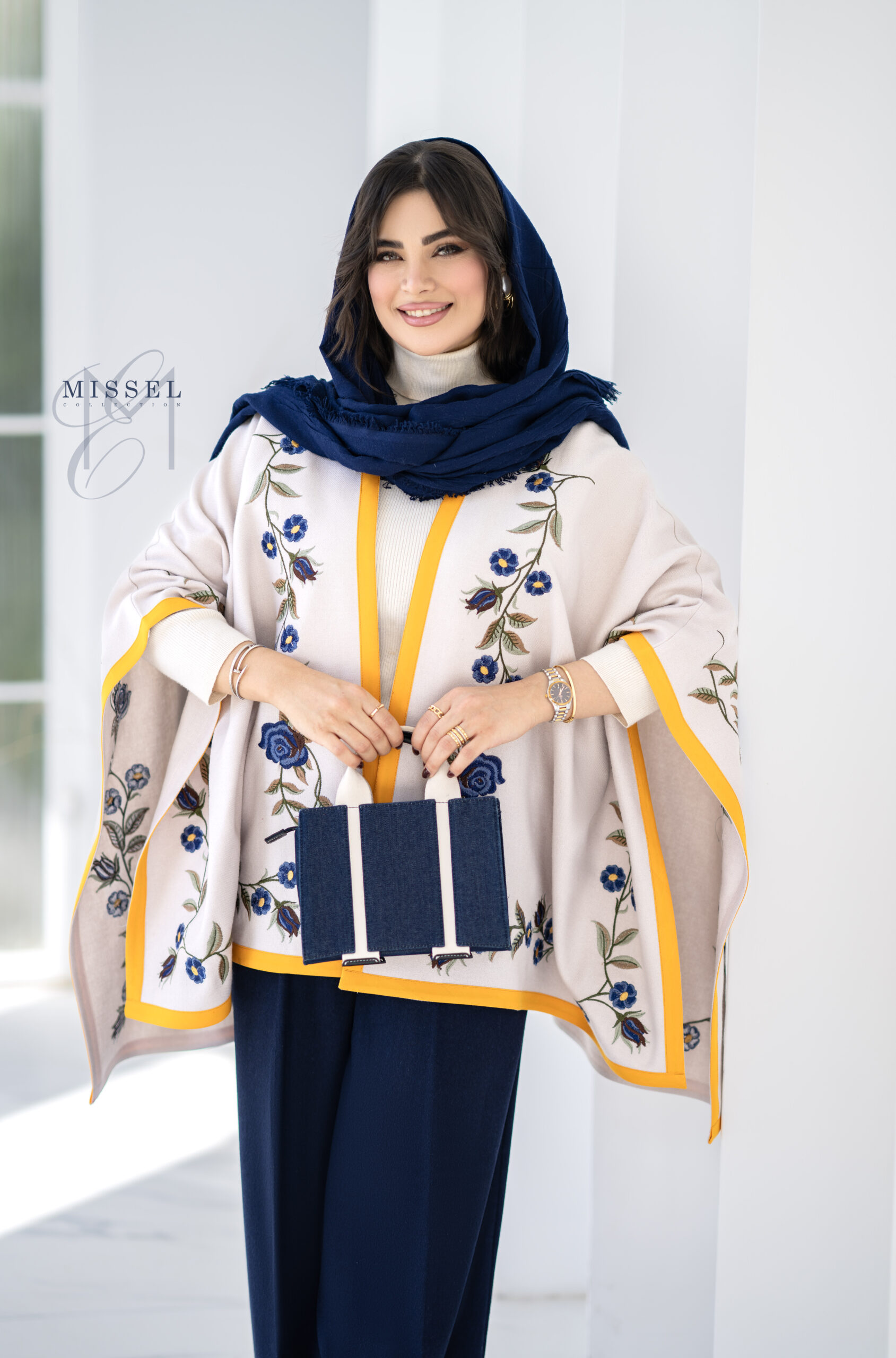 نغمه تلفیقی از لطافت و جسارت در طراحی است. گل‌های سورمه‌ای کارشده با ظرافت روی پارچه، در کنار نوار نارنجی ، تضادی چشم‌نواز و گرم ایجاد کرده‌اند. فرم آزاد پانچو، حس رهایی و آرامش را به استایل می‌بخشد و آن را به انتخابی خاص و متفاوت تبدیل می‌کند