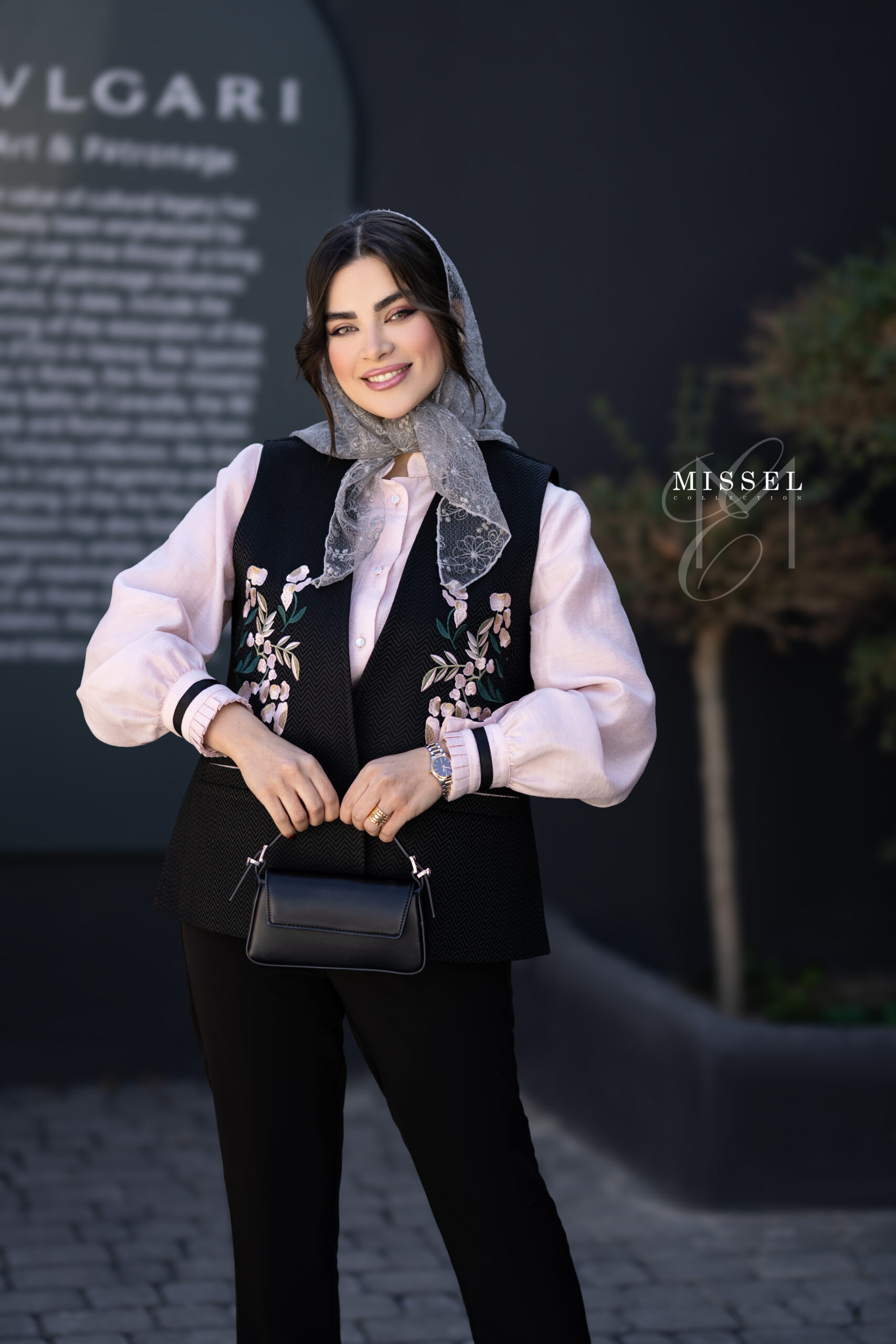 • وست مشکی با گلدوزی شکوفه صورتی، ایجاد تضاد چشمنواز و خاص